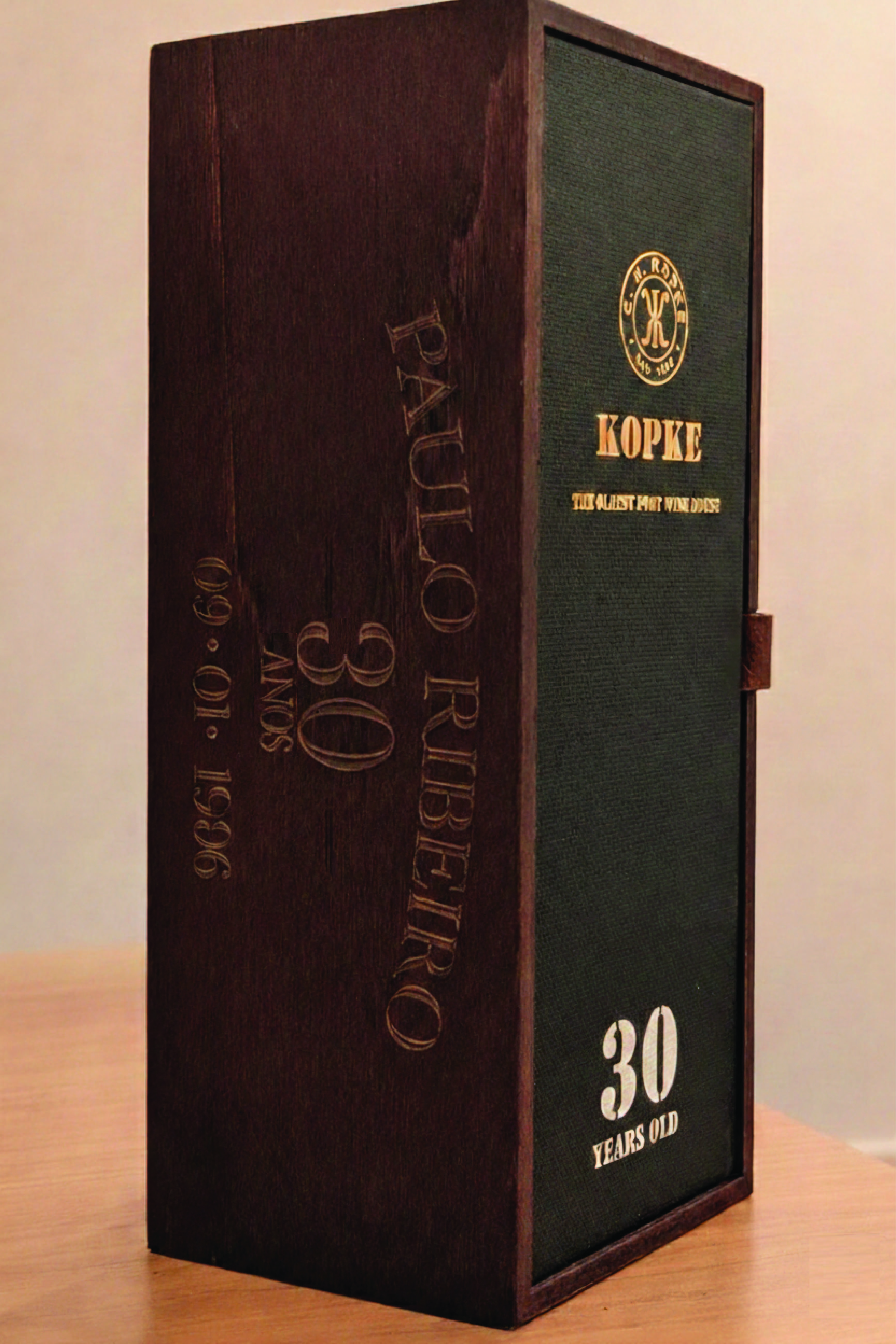 Inclui uma garrafa de Vinho do Porto Kopke 30 Years Old (75 cl) e respetiva caixa de madeira com gravação personalizada na lateral, executada com rigor para tornar cada exemplar verdadeiramente exclusivo.