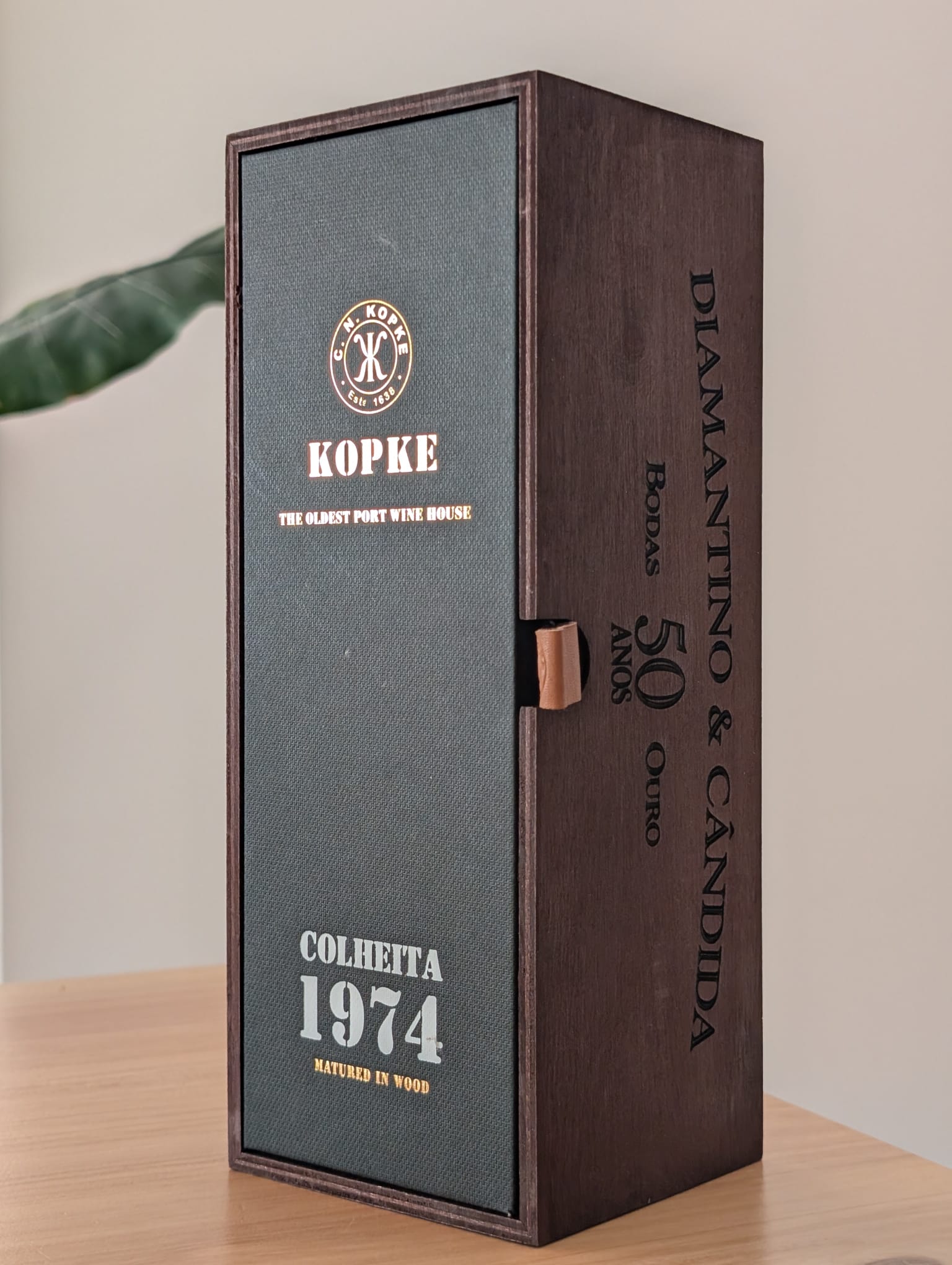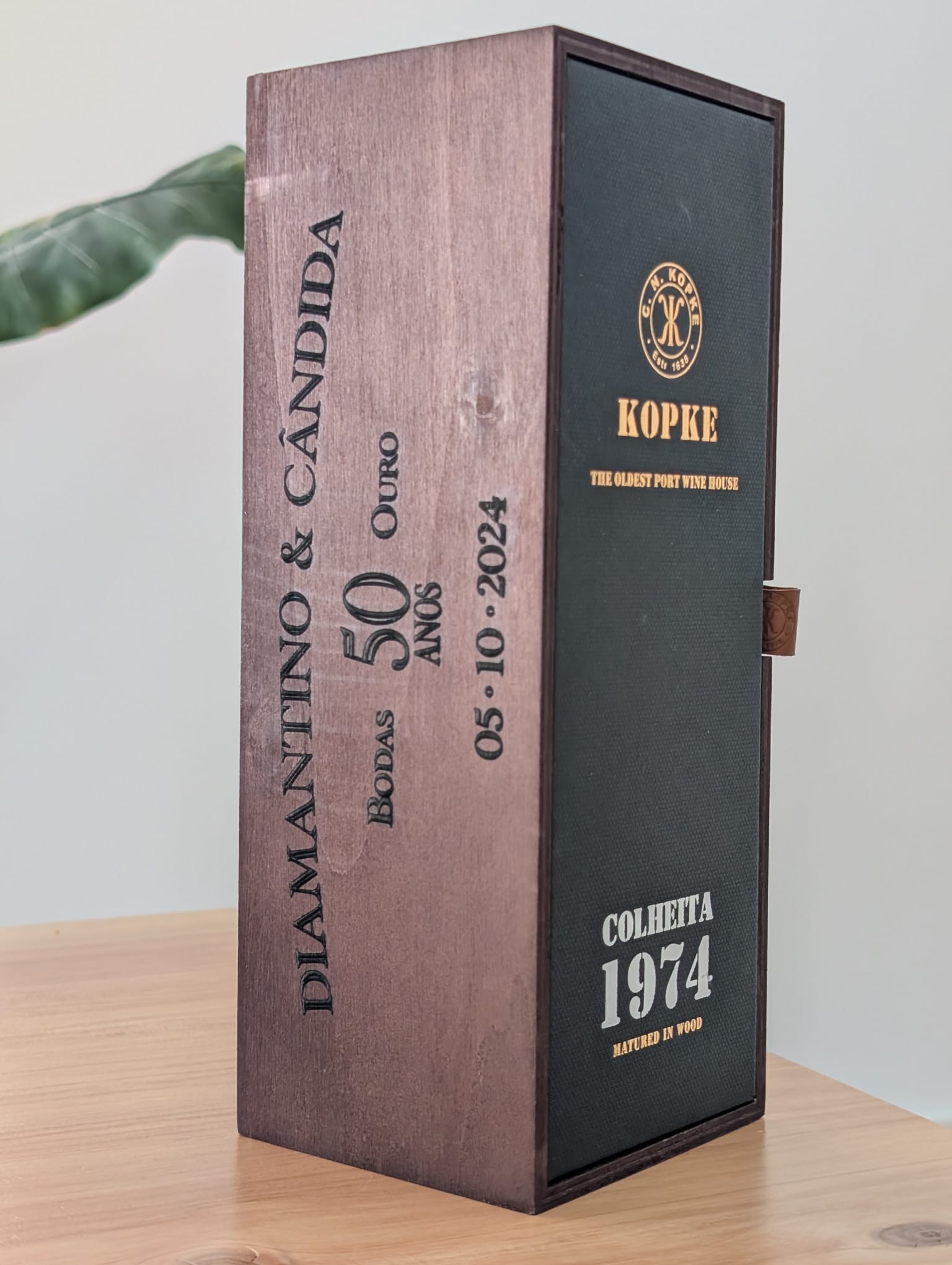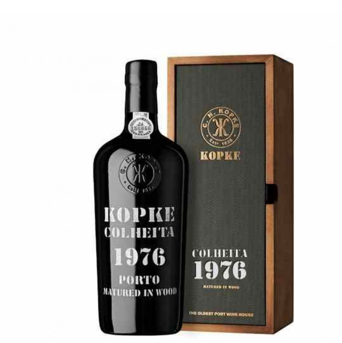Esta oferta exclusiva inclui uma garrafa de Porto Kopke 1976 Colheita 75 C com uma gravação personalizada na caixa (laterais).